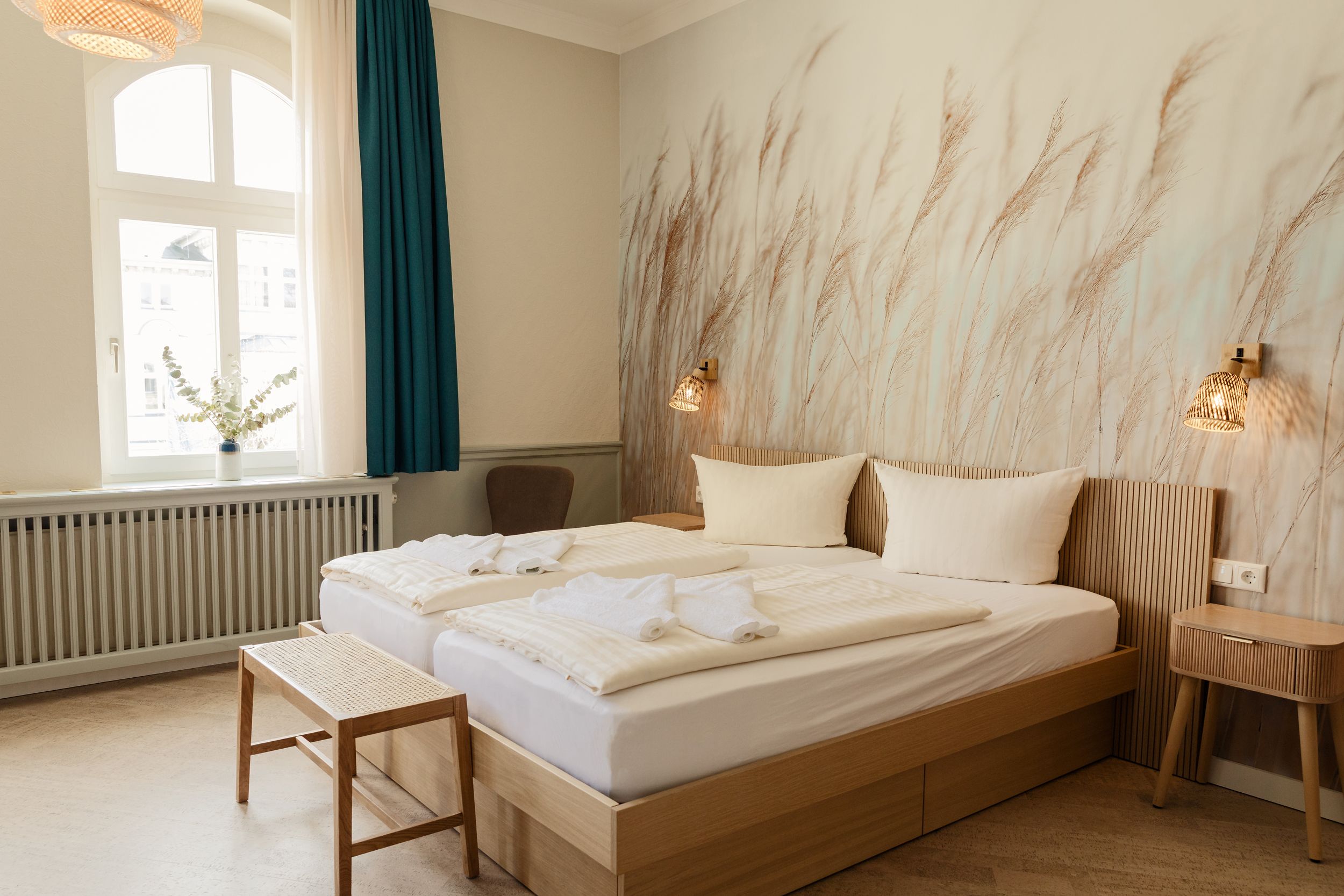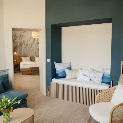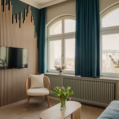 Bestehend aus großzügigem Schlafzimmer mit Doppelbett und Wohnzimmer mit ausziehbarer Doppelbettcouch, bieten die beiden Turmsuiten des Hotels Platz für bis zu 4 Personen. Der Clou: Das Wohnzimmer liegt im Turmerker des Hotels und gewährt dank zahlreicher Fenster einen Rundumblick auf die Flaniermeile und Promenade. Zur Grundausstattung der Zimmer gehören Dusche, WC, Föhn, Sat TV, Telefon, WLAN, Minibar und Safe.